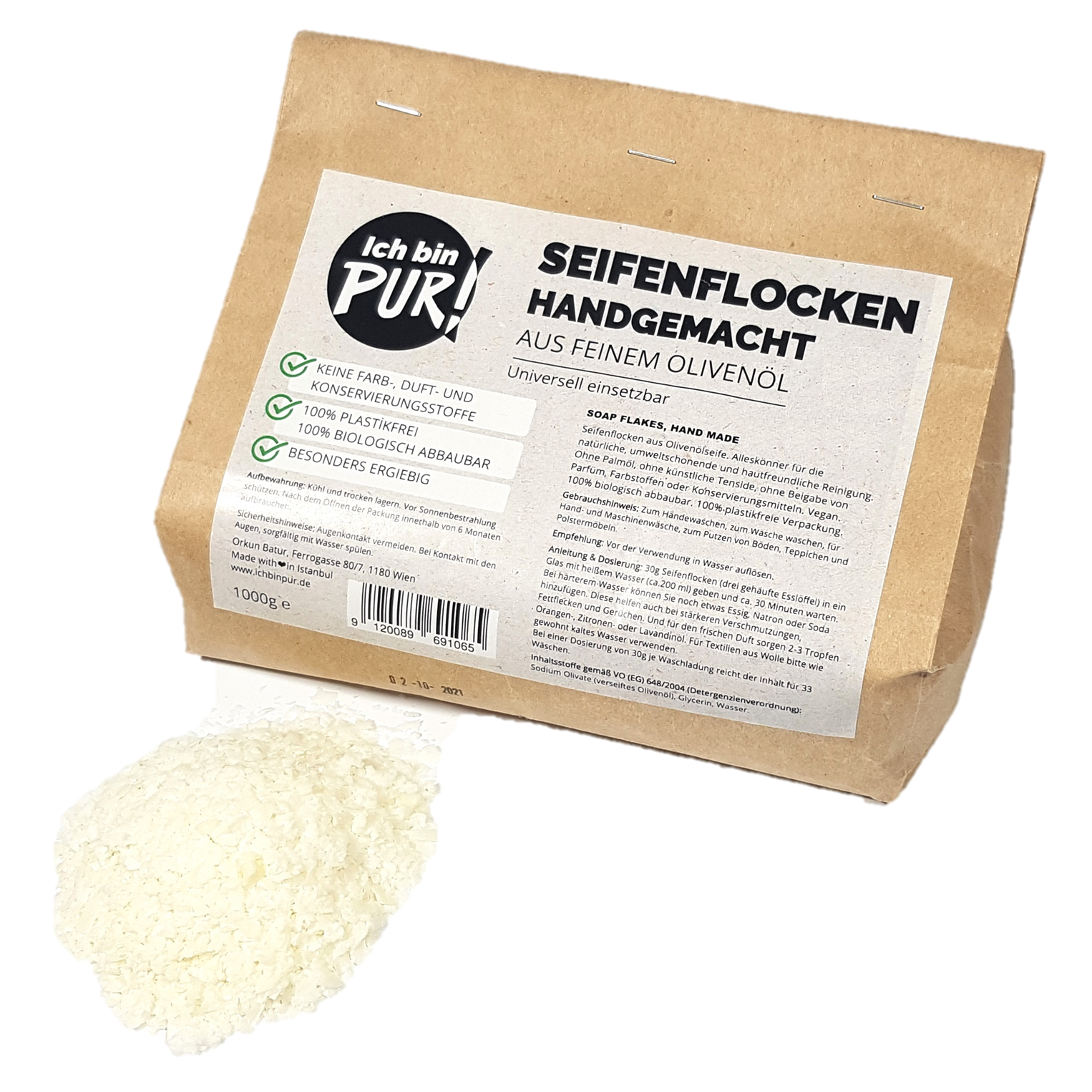 Seifenflocken aus Olivenölseife. Alleskönner für die natürliche, umweltschonende und hautfreundliche Reinigung. Ohne Palmöl, ohne künstliche Tenside, ohne Beigabe von Parfüm, Farbstoffen oder Konservierungsmitteln. Vegan. 100% biologisch abbaubar. 100% plastikfreie Verpackung.